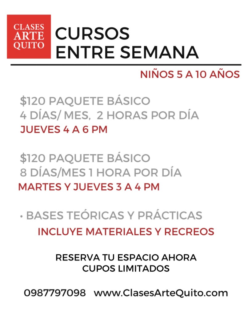 Aprendemos a modo de juego, vemos todas las técnicas: dibujo, pintura y modelado, entenderemos a los colores, trabajamos motricidad, composición, uso correcto de materiales y un poquito de historia del arte tanto ecuatoriano como internacional.